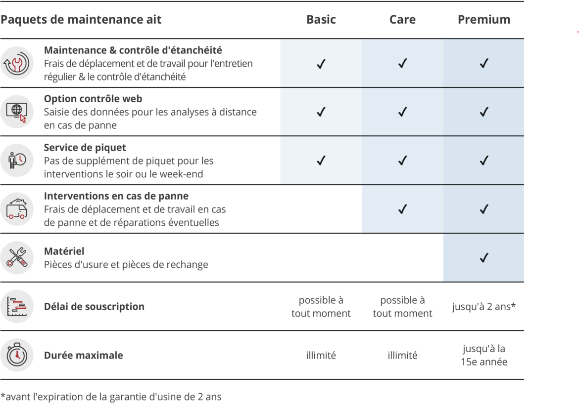 Comme certains paquets de services ne sont pas disponibles pendant toute la durée de vie de la pompe à chaleur, nous vous recommandons de vous faire conseiller sur les différentes possibilités déjà pendant la période de garantie.