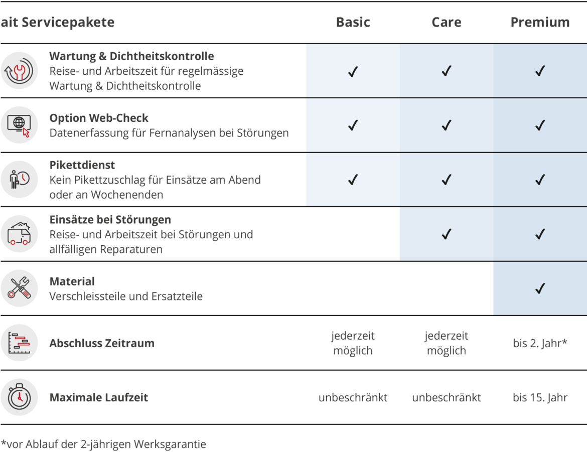 Da gewisse Servicepakete nicht über die gesamte Lebensdauer der Wärmepumpe verfügbar sind, empfehlen wir Ihnen, sich bereits während der Garantiezeit über die verschiedenen Möglichkeiten beraten zu lassen.